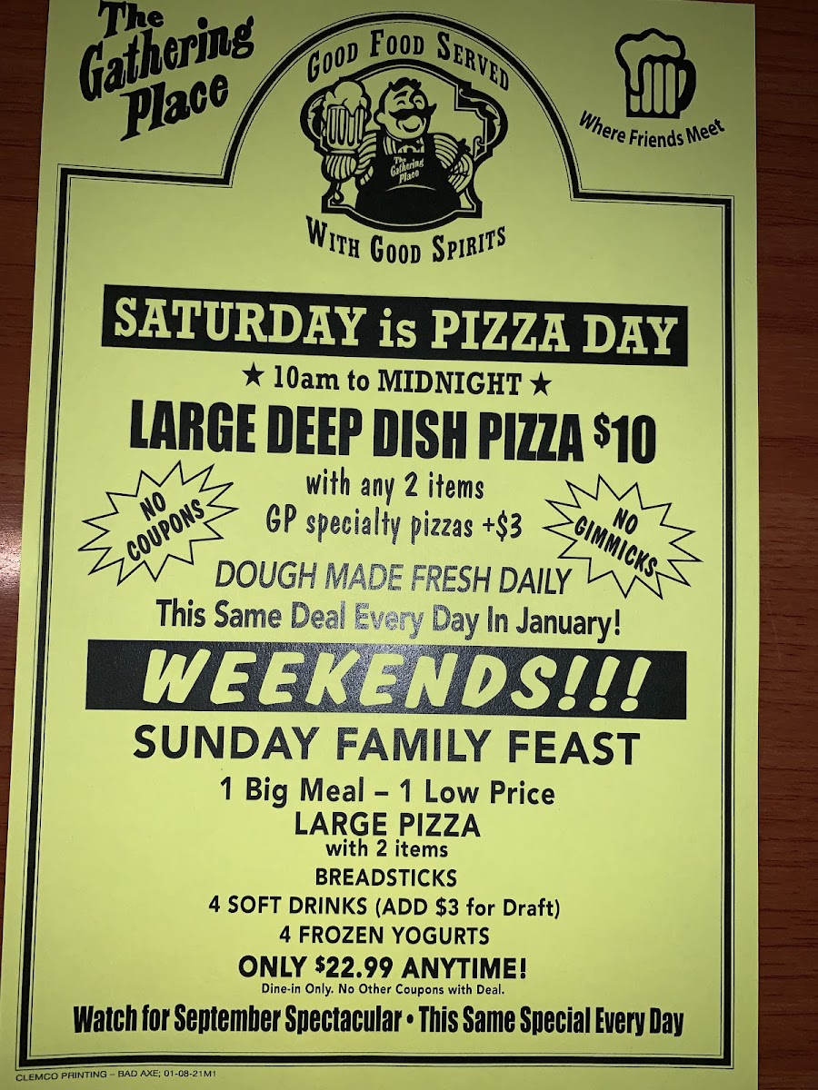 The Gathering Place, located at 898 N Van Dyke Rd, Bad Axe, MI, offers a delightful culinary experience that invites you to relax and enjoy. This charming restaurant features a diverse menu, ranging from delectable wraps and sandwiches to hearty deep-dish pizzas. Guests rave about the exceptional customer service and inviting atmosphere, creating a lovely space for families and friends to gather. Highlights include their mouthwatering flatbread pizzas and gluten-free options, which are perfect for various dietary needs. With friendly staff and a cozy setting connected to a hotel, The Gathering Place is a must-visit destination for casual dining and unforgettable meals.